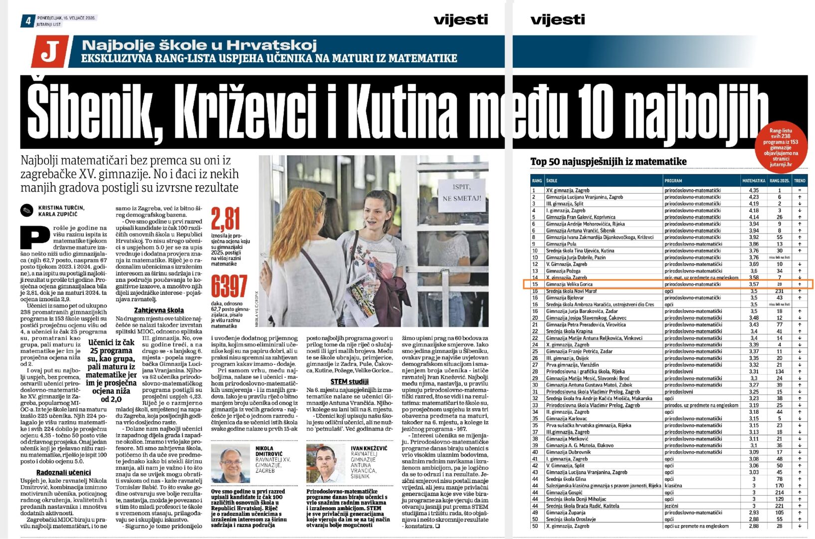 Objava rang-liste uspjeha učenika na državnoj maturi iz matematike u tiskanom izdanju Jutarnjeg lista od 16.2.2026. donijela je vrijedan uvid u kvalitetu gimnazijskog obrazovanja u Hrvatskoj te potvrdila visoku poziciju Gimnazije Velika Gorica među najuspješnijim školama. Analiza je obuhvatila ukupno 238 programa iz 153 gimnazije, što rezultatima daje dodatnu težinu i relevantnost. Naša škola zauzela je 15. mjesto prema uspjehu učenika na maturi iz matematike. Takav plasman svrstava školu među desetak posto najuspješnijih gimnazijskih programa u državi. Posebno je značajno što škola bilježi pozitivan trend napretka u odnosu na prethodnu godinu. Time se potvrđuje kontinuitet kvalitetnog nastavnog rada i sustavna priprema učenika za zahtjevne ispite.