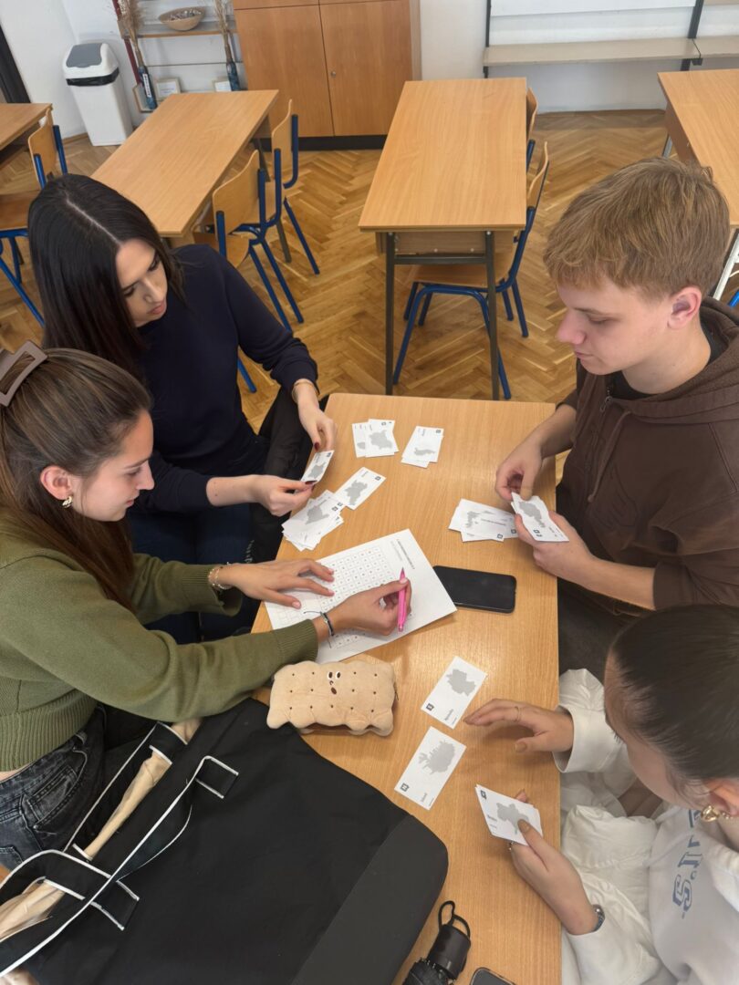 U nastavku aktivnosti, kroz timsku igru, radili su s kompletima kartica na kojima su bili prikazani oblici i imena europskih država. Njihov je zadatak bio što brže izdvojiti 27 država članica Europske unije te zadržati samo kartice tih zemalja. Na svakoj se kartici nalazilo i jedno slovo, a spajanjem prikupljenih slova uz pomoć ključa za dešifriranje, skupine su otkrile skrivenu poruku na engleskom jeziku: „Let us build our future together”.